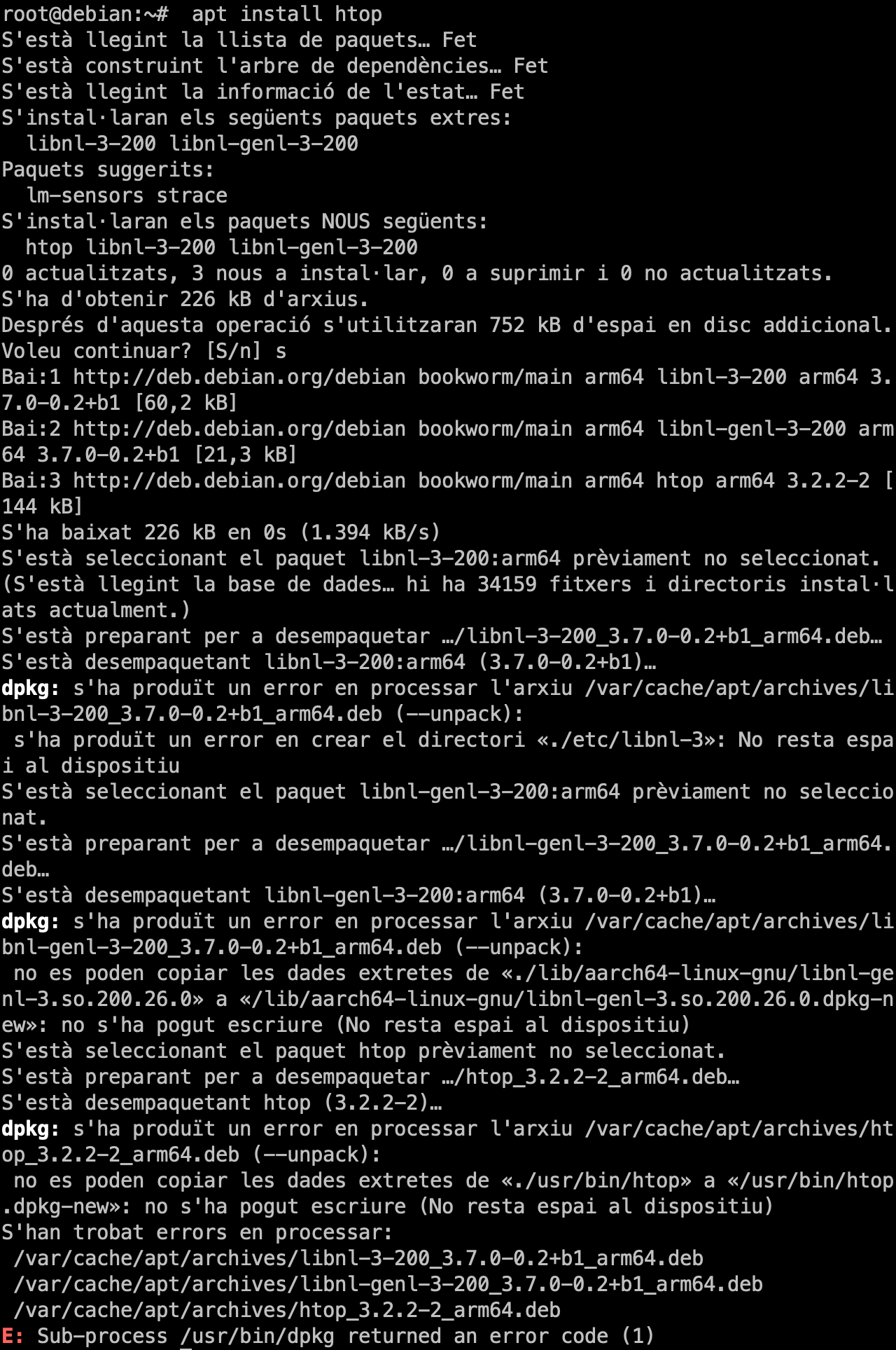 Intenta instal·lar un paquet amb apti comprova que el sistema fallaCom podeu veure, el sistema fallarà ja que no té espai suficient per a instal·lar el paquet. Això és un problema greu ja que el sistema no podrà funcionar correctament fins que no alliberem espai en la partició principal.