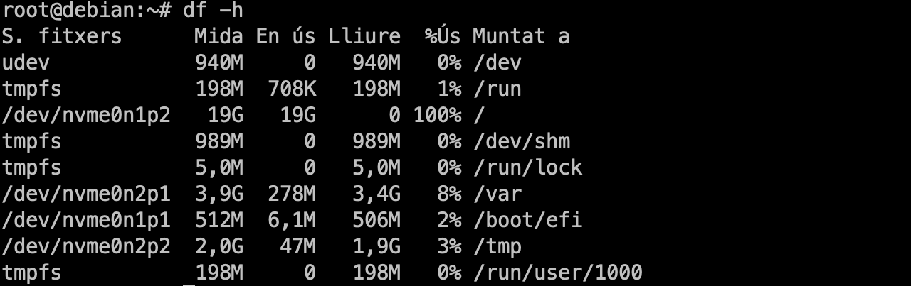 /dev/nvme0n2, però pot variar en funció de la configuració de la màquina virtual, utilitza la comandalsblkper a identificar el disc dur addicional. Utilitza el nom correcte actualitzant-lo en les comandes que apareixen en aquest exercici.