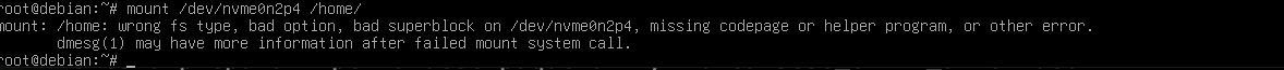 mount /homeSi la partició /home s’ha corromput, hauríeu de veure un missatge d’error com aquest: