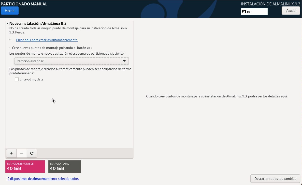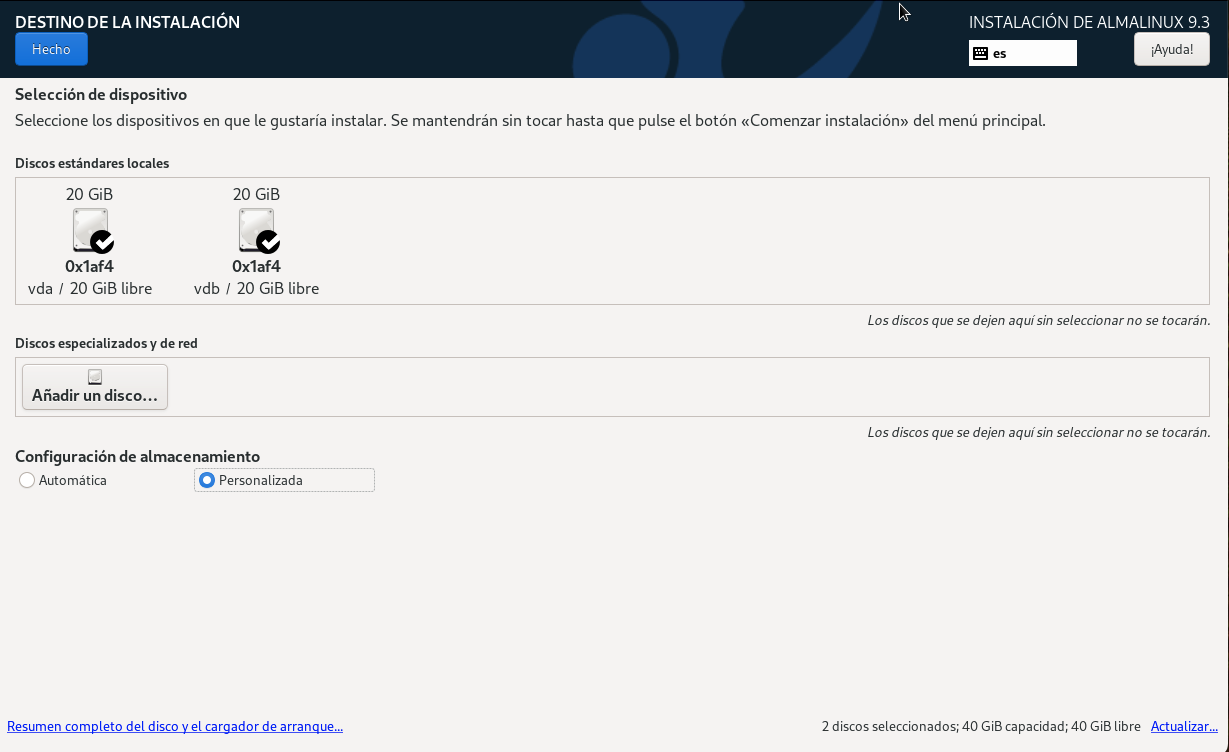 Inicieu la instal·lació d’Alma Linux fins a la pantalla de selecció de discs.