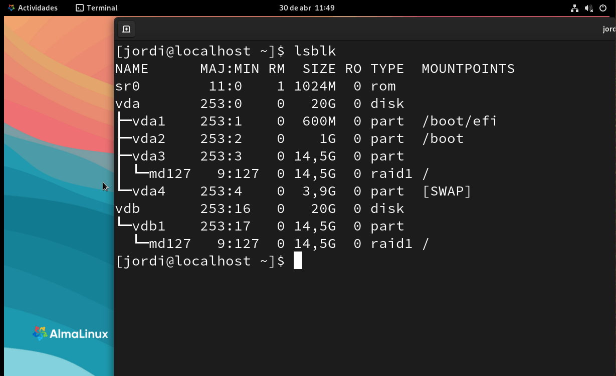 /boot/efi→ RAID1 amb vdb1 i vdc1./boot→ RAID1 amb vdb2 i vdc2.swap→ RAID1 amb vdb3 i vdc3./→ RAID1 amb vdb4 i vdc4.