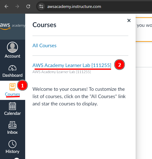 Ara que heu creat el vostre compte d’AWS Academy, podeu accedir al tauler d’AWS. El primer que heu de fer és fer clic a la pestanya Courses (1) a la part esquerra de la pantalla. Veureu una llista de cursos disponibles per a vosaltres. Feu clic al curs AWS Academy Learner Lab (2), com es mostra a la captura de pantalla següent: