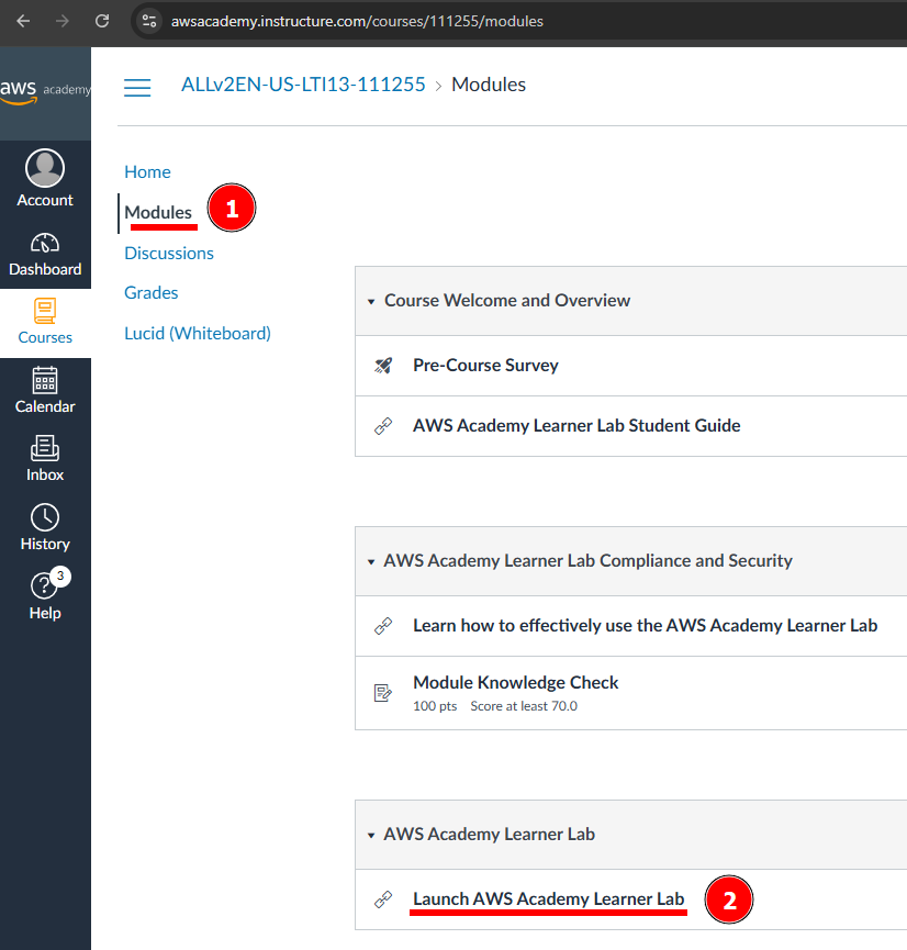 Ara hem de buscar la pestanya Modules (1) a la part esquerra de la pantalla. Feu clic en ella i veureu una llista de mòduls disponibles per a vosaltres. Feu clic en el mòdul AWS Academy Learner Lab (2), com es mostra a continuació: