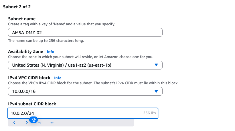 - AMSA-DMZ-02: Subxarxa pública a la zona us-east-1b. Aquesta subxarxa allotjarà la instància EC2 que farà de pont segur d’accés (mitjançant túnel SSH) per a la gestió de tots els recursos privats. (10.0.2.0/24).