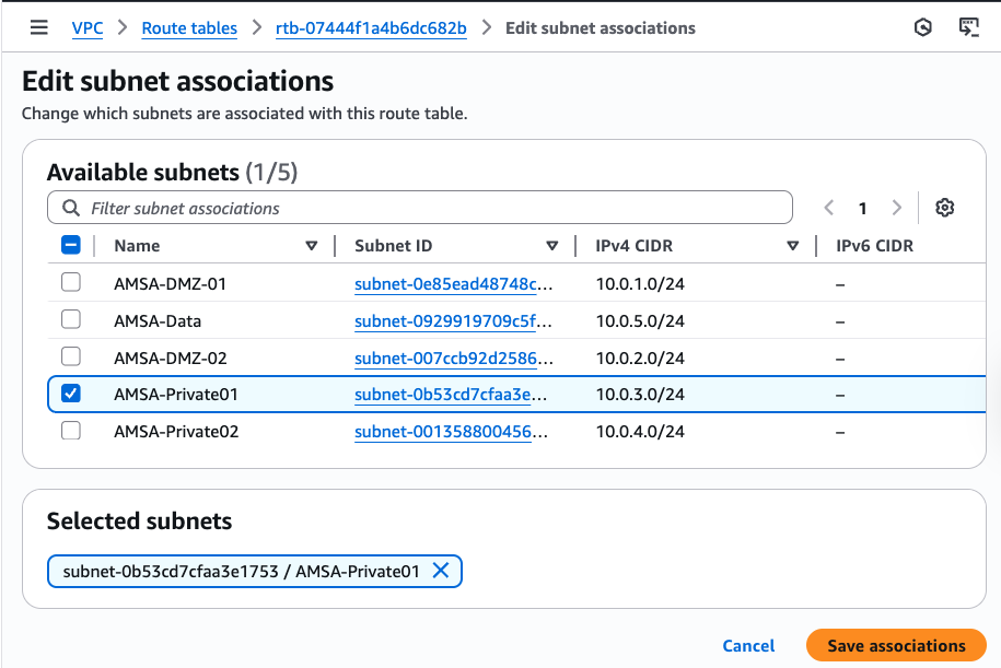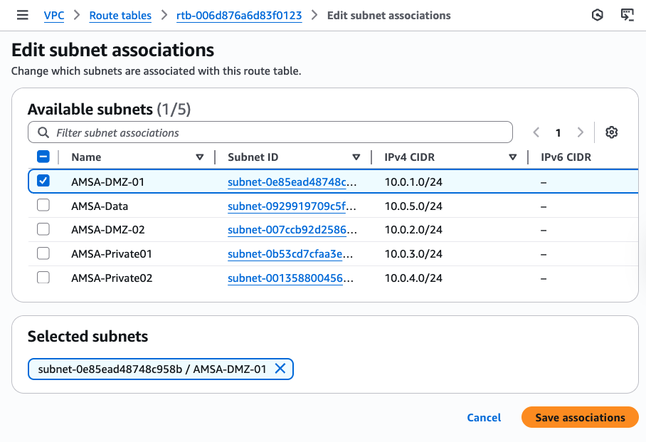 Realitzeu els mateixos passos per a la subxarxa AMSA-DMZ-02, modificant només el nom de la taula de rutes i l’associació amb la subxarxa.