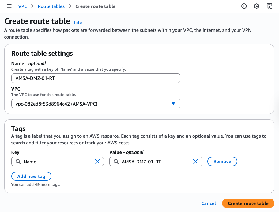 El primer pas és crear la taula de rutes per a les subxarxes públiques. Aneu a VPC → Route Tables → Create route table. Seleccioneu la VPC AMSA-VPC i anomeneu la taula de rutes AMSA-DMZ01-RT.