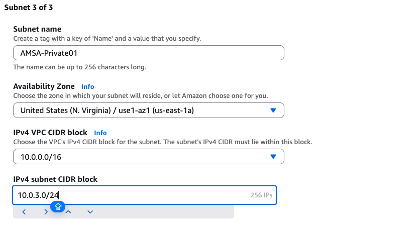 - AMSA-Private01: Subxarxa privada per a les instàncies de WordPress a la zona de disponibilitat us-east-1a. (10.0.3.0/24).