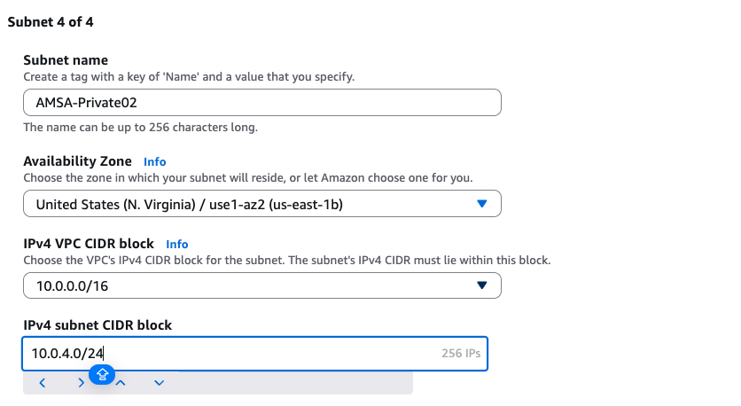 - AMSA-Private02: Subxarxa privada per a les instàncies de WordPress a la zona de disponibilitat us-east-1b. (10.0.4.0/24)