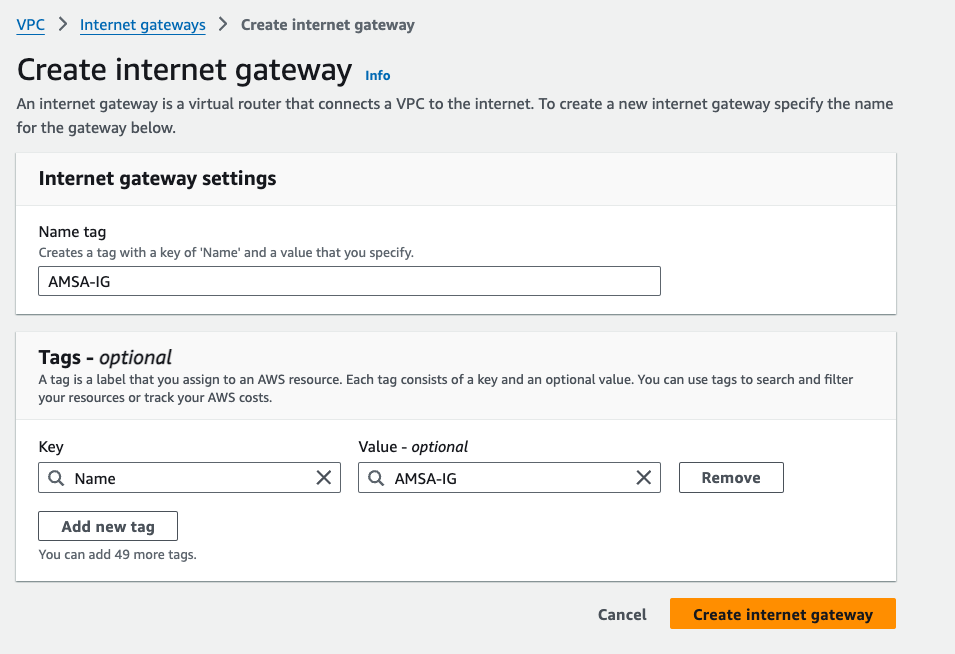 El primer pas és crear el Gateway d’Internet. Aneu a VPC → Internet Gateways → Create internet gateway. Un cop creat, l’anomeneu AMSA-IG.